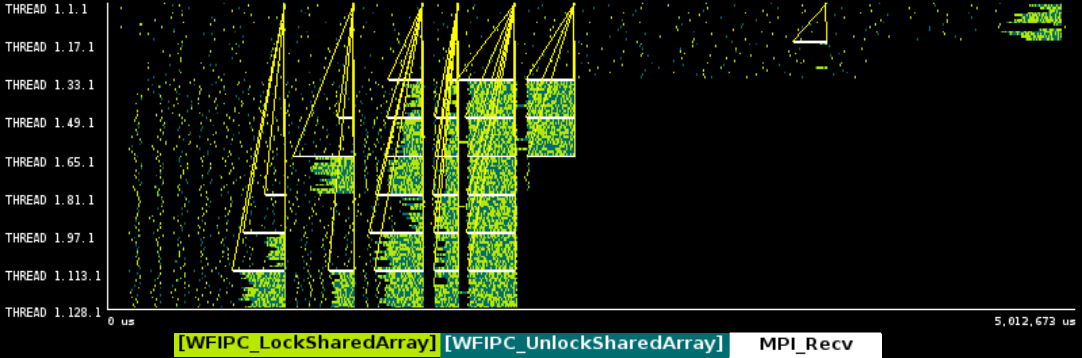 これらブロックでは、共有メモリー配列のロック/アンロック呼出しが頻繁に行われますが、これはノードのマスタランクがグローバルマスタからデータを得る際のMPI_Recvによる待ち時間に相当するものです。図5は、この呼出しと待ち合わせに関する最初のセクションを拡大したものです。