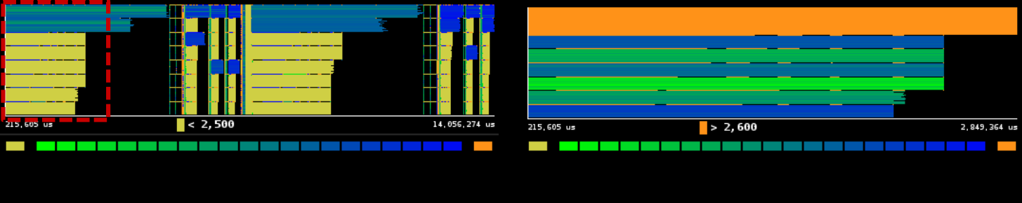 図4は、ROI2の共有メモリールーチン呼出しのタイムラインです。ほとんどの呼出しはロックとアンロックであることが解ります。これらは2つのパターンに分類され、一つは呼出し間に空白を持つストライプ状のもので、もう一つは解像度を超えた周期で呼び出されて稠密なブロックに見える部分です。