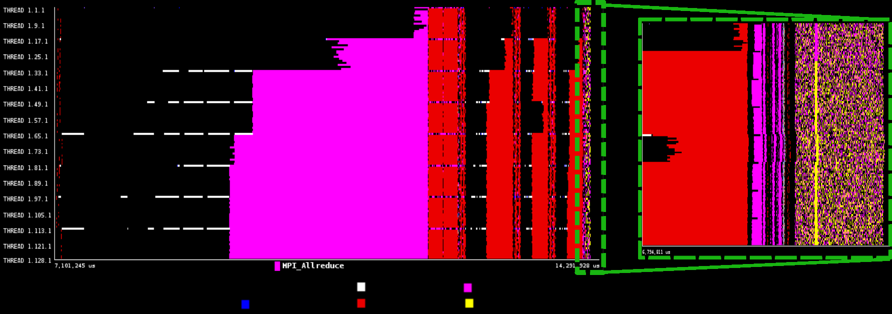 図7:128コアを用いたROI2の1繰返し。MPI呼出しパタンを緑で示し、拡大した。