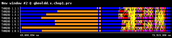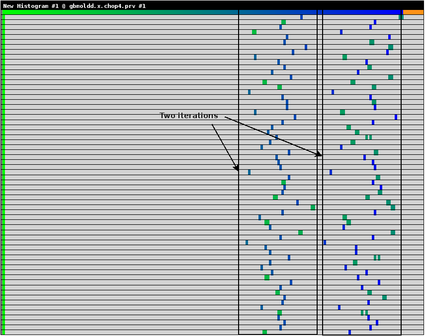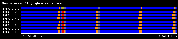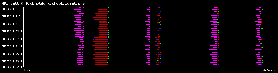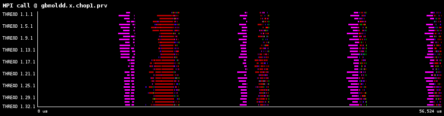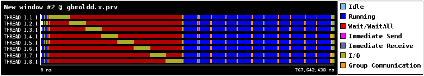 各時間ステップは琥珀色で示されたMPI_Allreduceで分離されます。MPI_Allreduce直後に、分子データを通信する大量のMPI_IsendとMPI_Irecvが呼び出され、小さな計算が散在しています。次に青色の分子間力計算を示すより大きな計算が続きます。赤色部分は、ノンブロッキング通信の完了を待つMPI_WaitとMPI_Waitallを示します。図2には、各時間ステップの最後にプロセス番号1のみで行われる小さなI/Oが示されています。これは負荷分散に寄与しますが、少量のため調査はしていません。。