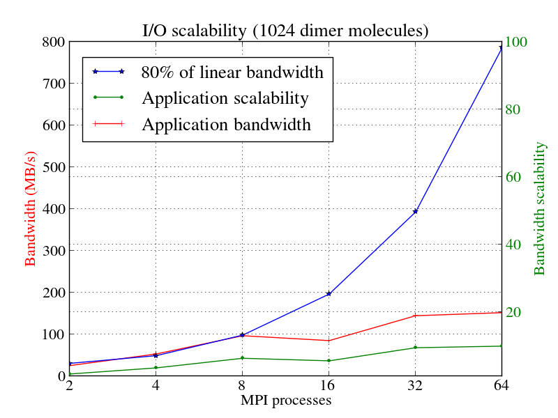 GBmolDDの並列I/Oスケーラビリティを図11aに示します。青線が全バンド幅の80%を示します。全バンド幅は、一つのMPIプロセスのバンド幅に沿うプロセス数を掛けたものです。赤線はアプリケーションのI/Oバンド幅です。緑線はI/Oスケーラビリティで、nプロセスのバンド幅を1プロセスのバンド幅で割ったものです。
