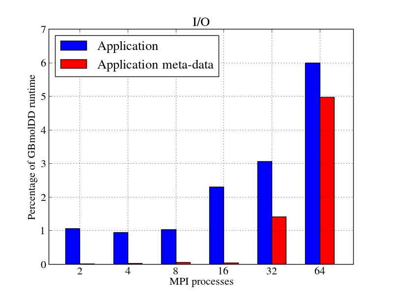 - GBmolDDのI/O実行時間の比率は、図11b(青色バー)の様に増加していきます。これは、図11bに示された通り、そのI/Oの大部分がメタデータフェーズ(赤色バー)に費やされるためです。1024ダイマー分子の単純なケースではI/Oはボトルネックではありませんが、分子数が増えて大きな系なると、例えば文献[1]の様にボトルネックになるでしょう。