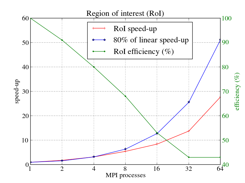 図からわかる通り、並列スケーラビリティはMPIプロセスの増加に伴い減少します。64プロセス時において、ROIと全アプリケーションの並列スケーラビリティはそれぞれ27.8と21.4です。同じく、並列効率はそれぞれ43%と33%です。スケーラビリティと効率は明らかにROIの方が高くなっています。これは、ROIがI/Oや初期化および終了処理が含まれないためです。