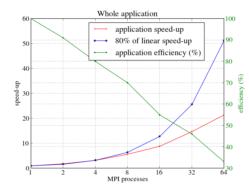 ここで、$T_n$はnプロセスの実行時間です。青色の線は80%の線形スケールを示し、赤色はアプリケーションのスケールを示します。緑の線は並列効率を%で示します。このセクションの性能結果はトレース結果ではなくコードから得た数値です。