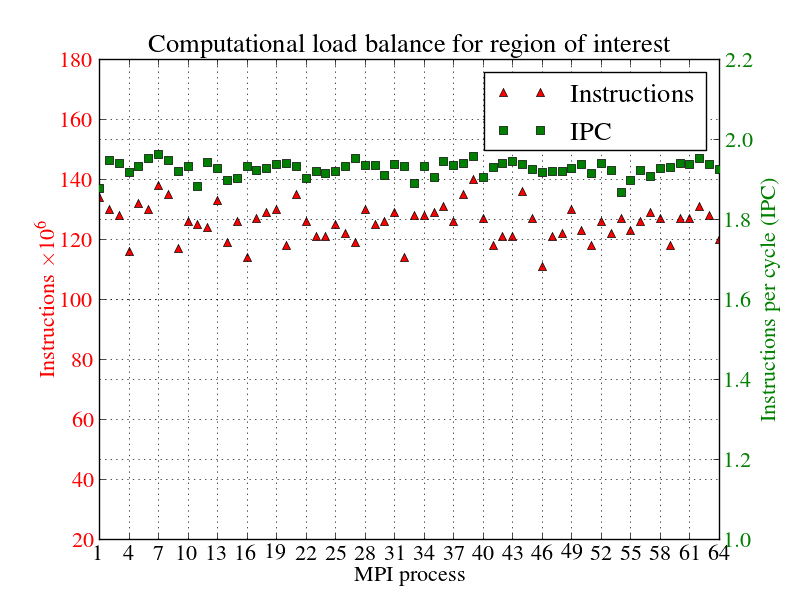 64プロセスでのROIに対する、計算の負荷バランスを図5示しました。赤点はプロセス毎の(通信以外の)命令数、緑点はIPCを示します。