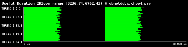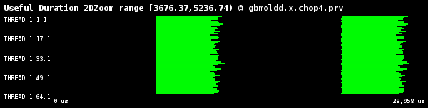 完全に負荷バランスする場合、ヒストグラムは横1線の同色のブロックとなります。ヒストグラムは3種の時間を表します: