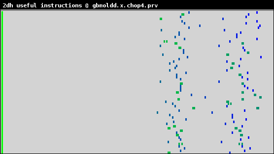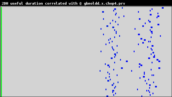 特にIPCは良好な負荷バランスを示しています。継続時間ヒストグラム(useful duration histogram)を図6に示します。これは64プロセス実行時のMPIルーチン呼出し間の継続時間が示されています。横軸は計算継続時間、縦軸はプロセス数です。薄い緑は希薄な部分、濃い青が高い密度を示します。
