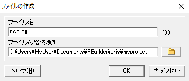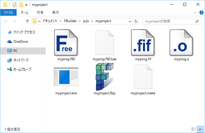 フォルダーの中に、ソースファイル(myprog.f90)や実行ファイル(myproject.exe)が在ることが分かります。