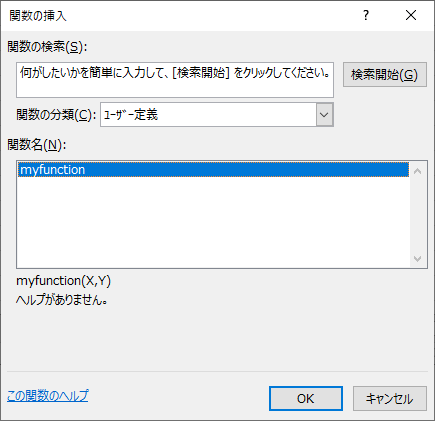 以下のように「関数の挿入」ウィンドウが表示されますので、「関数の分類」を「ユーザー定義」にし、myfunction を選択して「OK」ボタンを押してください。