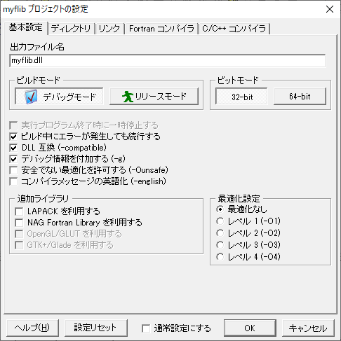 Fortran Builder は、実行形式(.exe)以外にも、ダイナミックリンクライブラリ(.dll)やスタティックライブラリ(.a)の作成が行えます。特に DLL は、様々な環境から使える強力な仕組みであるため、Fortran で書いた計算ルーチンを Excel や Python などの他の環境から使うことが可能です。