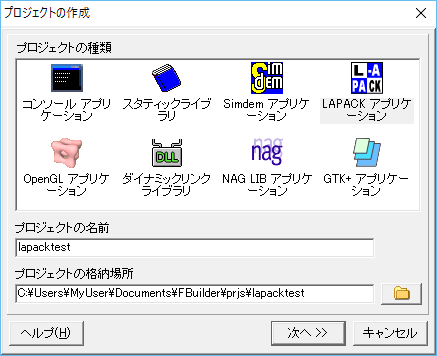 以下のような画面が表示されますので「LAPACK アプリケーション」を選択後に「プロジェクトの名前」を指定してください。