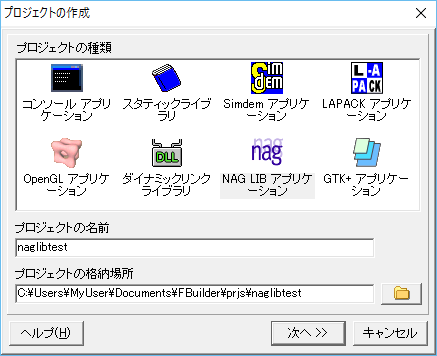以下のような画面が表示されますので「nAG LIB アプリケーション」を選択後に「プロジェクトの名前」を指定してください。