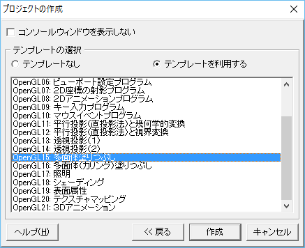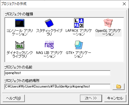 以下のような画面が表示されますので「OpenGL アプリケーション」を選択後に「プロジェクトの名前」を指定してください。