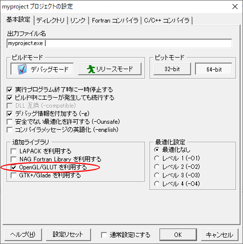 にチェックを入れるだけで、OpenGL/GLU ライブラリをリンクし、OpenGL/GLUT のサブルーチンを利用することができます。