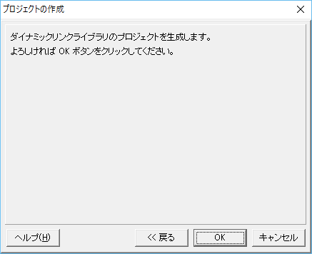 以下のような画面が表示されますので、「ダイナミックリンクライブラリ」を選択後に「プロジェクトの名前」を myflib として「次へ」ボタンを押してください。