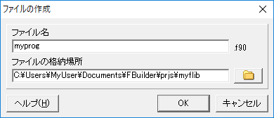 以下のような画面が表示されますので、「ファイル名」を myprog として「OK」ボタンを押してください。