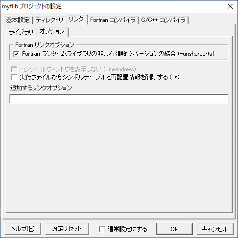 (これにより、プログラムの実行に必要な nAG Fortran Compiler のランタイムライブラリが、生成される DLL に結合されます。)