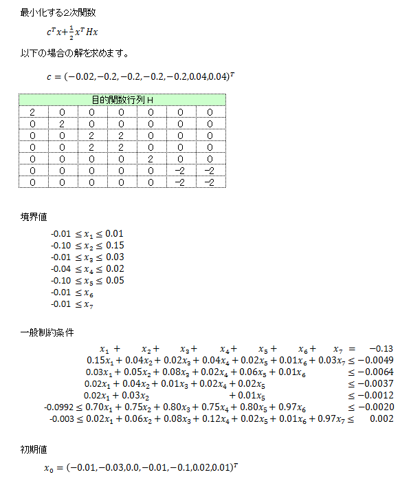 本サンプルは2次計画問題(密な)を解くFortranによるサンプルプログラムです。 本サンプルは以下に示される制約条件を満たす2次関数を最小化する解を求めて出力します。