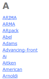 Aで始まるキーワードの一覧が表示されるので、ARIMA のリンクをクリックする