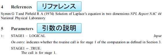 - 各ルーチン毎に存在するドキュメントでアルゴリズム、引数の詳細、エラー情報、リファレンス情報などが含まれる他、 そのルーチンを使ったExampleプログラム(及び与える入力データとそれによって得られる出力結果例)が含まれます。