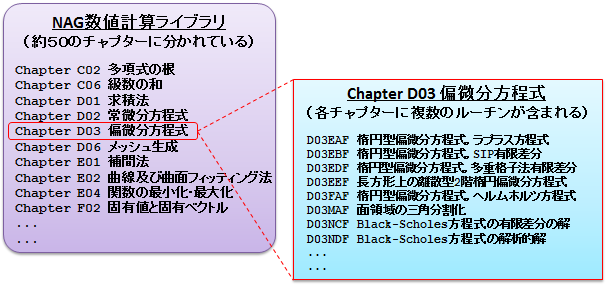 nAG数値計算ライブラリには1700種類以上の数値計算や統計解析の分野の問題を解くための様々なサブルーチンが含まれています。 これらの数多くのサブルーチンは個別の分野毎に約50の Chapter(チャプター)に区分されています。 そして各チャプターには同じ分野の複数のルーチンが含まれています。