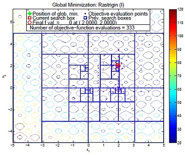 nAG数値計算ライブラリが提供するGlobal Optimizationルーチンはmulti-level coordinate search(MCS)法を用いて最適化を行います。 大域的な最適化処理部分が分木しながらまだ未探索である空間を再帰的に分割し、 局所的な最適化処理部分が局所的に良い関数値を持つ空間を分割します。