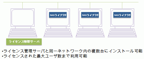 同一ネットワーク内のライセンス管理サーバーに接続されているマシンで、ライセンスされた同時利用者数の範囲内でご利用可能なライセンスです。