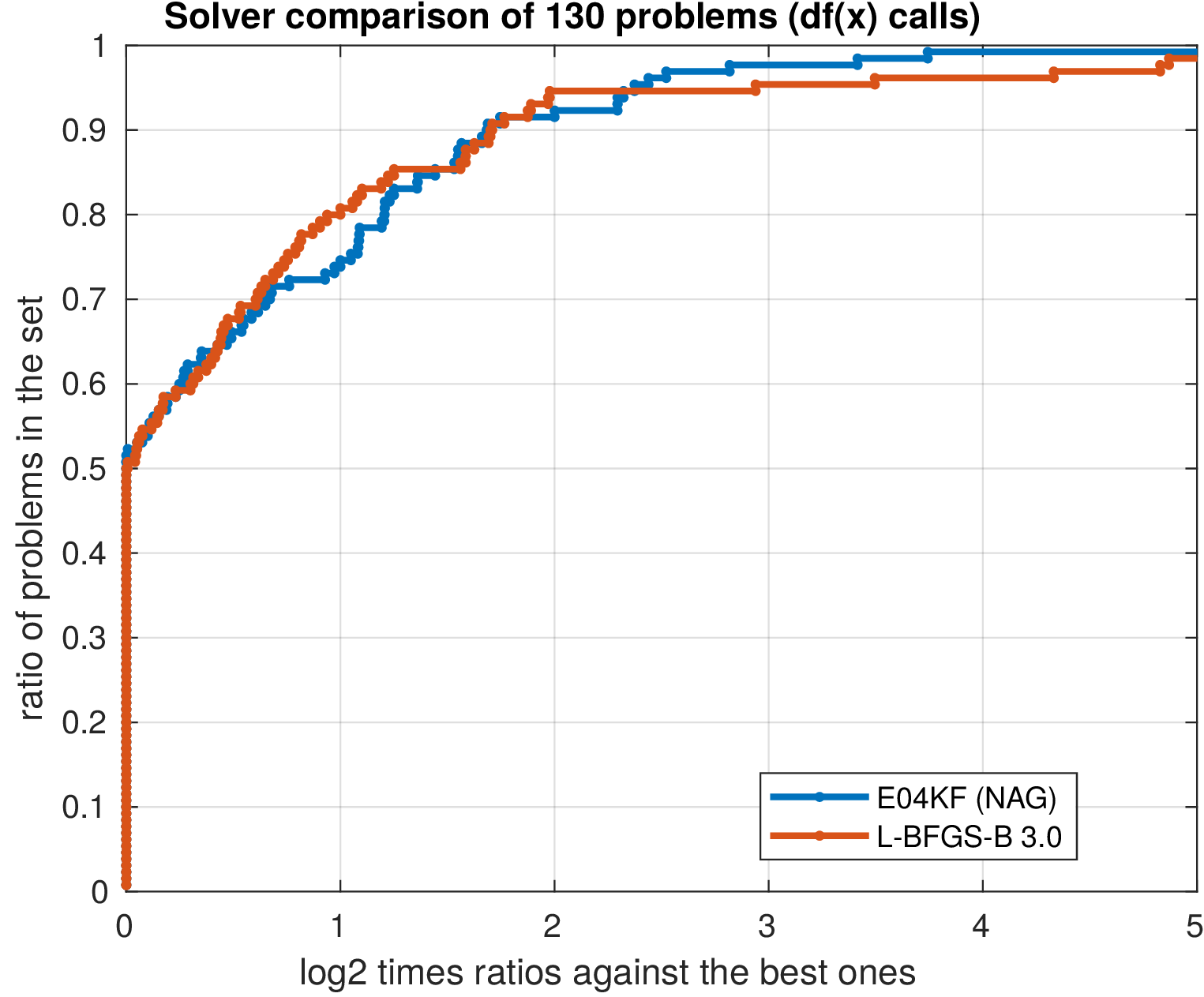 特筆すべきは、x=5の位置を見ると、nAG関数は130個の問題のうち99%をL-BFGS-Bの32倍以内の時間で解いているのに対し、L-BFGS-BがnAG関数の32倍以内の時間で解けた問題は95%にとどまっています。これは、L-BFGS-BがnAG関数の32倍以上の時間をかけても解けない問題が5%存在することを意味します。実用上、これはnAG関数の方がより多くの問題に対して収束性が高いことを示しています。