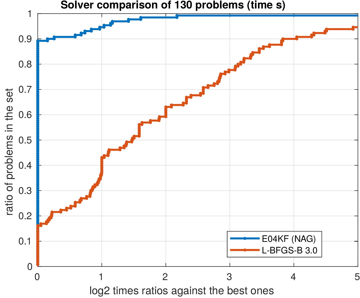 以下のグラフは、130個のベンチマーク問題に対するnAG関数とL-BFGS-Bの計算時間の比較結果を示しています。
