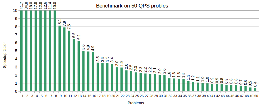 最大のスピードアップ要因は、特化したソルバーである e04nq がQP構造に合わせて調整されており、ヘシアン(二階微分)がすべてのxに対して一定であるという事実を利用していることです。一方、一般的なソルバーである e04vh は二階微分を要求しないため、同じ情報にアクセスすることはできません。一般的に、二階微分を使用できるNLPソルバーは、反復ごとの計算コストが高くなります。(例えば、ヘシアンの因数分解や近似値の部分的な更新を、反復ごとに行う必要があります)