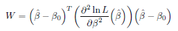 はモデルパラメータβの最尤推定値で、lnL は対数尤度関数です。検定統計量W は以下の式で表される仮説を検定するのに使用することができます: