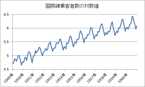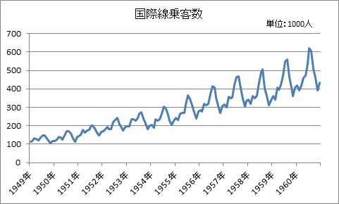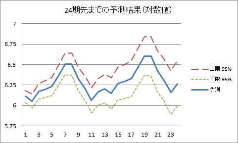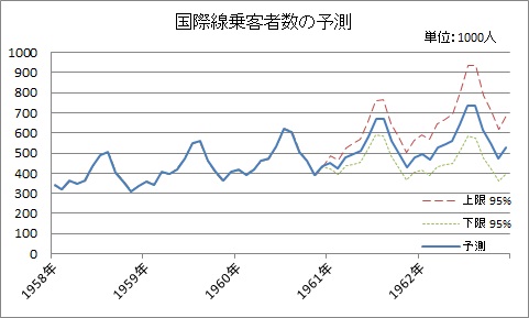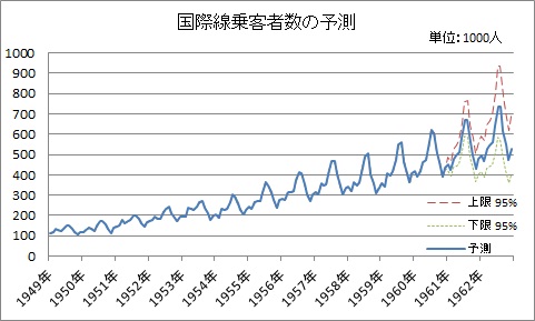 1949 年 1 月から 1960 年 12 月までの 144 ヶ月の国際線乗客者数のデータを使用し、 SARIMA ( 0, 1, 1 ) × (0, 1, 1 ) 12モデルでフィッティングを行い、 24 ヶ月先までの予測を行います。