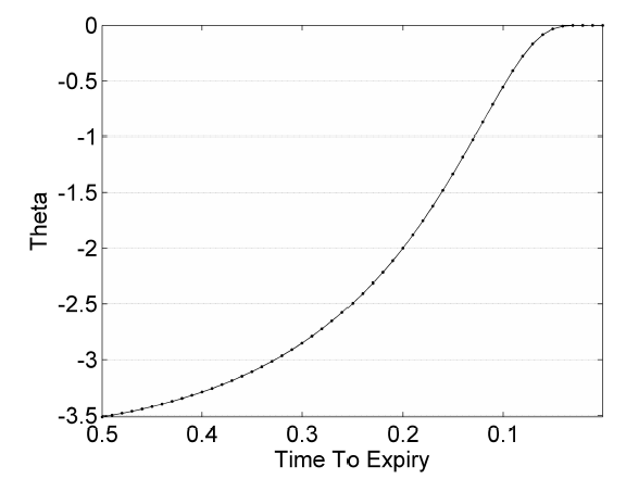 Theta (Θ) はオプション、T の権利行使残存期間の変動に対するオプション価格の感応度です。残存期間は通常減少していますので(増減可能な他の従属パラメータとは異なり)、偏導関数の負数をとるのが一般的です。