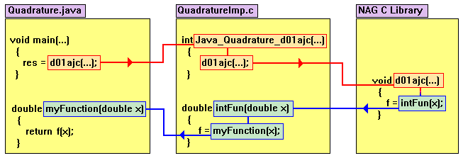 これまでと同様、Cソースファイル中には適切な nAG C Library ヘッダファイルが含まれていなくてはならない。Java_Quadrature_d01ajc という名前の関数はJavaで宣言されたメソッド d01ajc をCで実装したものである。