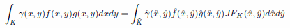 質量行列、剛性行列への要素からの寄与の計算は次の公式を用いてアイソパラメトリックに計算することができる。