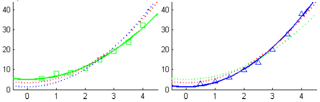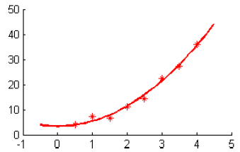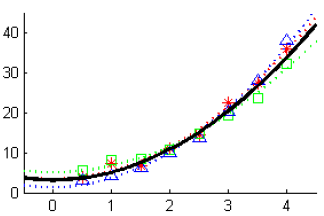 最後のコマンドは各データセットの実際のフィッティング誤差を示しています。計算された商はa = 1.91428、b = 0、c = 3.14526 で合計誤差は (alpha) 25.2803 、各フィッティング誤差(err[i]+alpha)は 25.2803、24.7906、24.7699です。