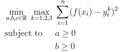 ここではyik(k = 1, 2, 3 )はそれぞれのデータセットの測定データです。最大誤差である特別な変数alpha を使用してAMPLでモデル化することができます: