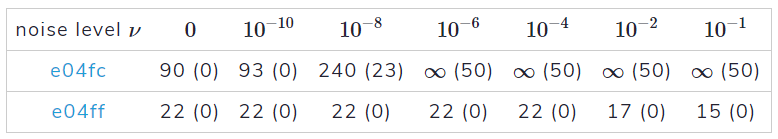 表1の数字は、問題を解くための評価数の平均(50回の実行で)を示している。括弧内の数字は、50回の実行のうち失敗した回数を示す。