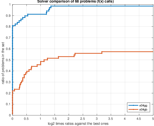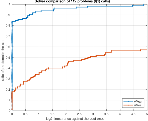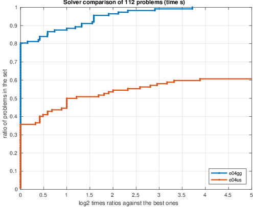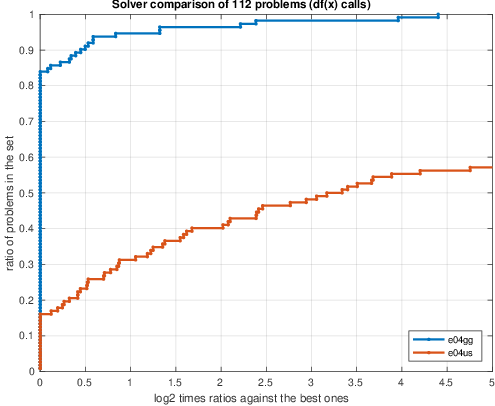 e04gbソルバーは単純境界を直接扱うように設計されていないので、このような問題には通常e04usが使用されます。しかし、より一般的なソルバーであるe04usは、単純境界の存在下ではe04ggのようにNLN-LSQ問題の構造を完全に利用することはできません。これが、45%の問題で高速化が見られる理由です。(d) 112の非制約および境界制約のある非線形最小二乗CUTEst問題についてe04usとe04ggを比較すると、65%の問題で関数と勾配の呼び出しが少なくて済んでいる事がわかります。(eとf)