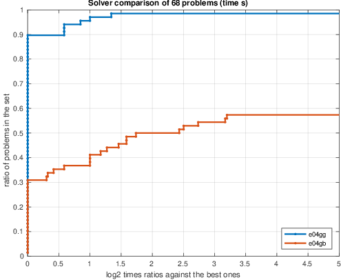 新しいソルバーe04ggは、ライブラリ内の従来ルーチン、つまり制約のない非線形最小二乗問題の場合はe04gb、単純な変数境界の問題の場合はe04us、に比べて、前例のない堅牢性と大幅な高速化を実現しています。 新しいソルバーにアップグレードすることを強くお勧めします。