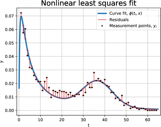 ここでの考え方は、m 個の観測されたデータ・ポイント (黒い点)に適合する平滑関数 (青い線)で表されるモデルのパラメー タ の最適値を見つけることです。つまり、モデルとデータの間の二乗誤差を最小化することです(垂直の赤いバー)。 e04ggはnAGライブラリ内の現在の非線形最小二乗ソルバーよりも大幅に改善されています。さらに、このソルバーは lsq_uncon_quasi_deriv_comp (e04gb)のような制約のないソルバーと、lsq_gencon_deriv (e04us) のような完全に制約のあるソルバーの間のギャップを埋めるものです。 e04ggはnAG最適化モデリングスイートの一部であり、スイート内のソルバーのインターフェースの明確さと一貫性を提供します。 この新しいソルバーはRutherford Appleton Laboratory [1]との共同研究から生まれたもので、数学的最適化における提供物の拡大と改善のためのnAGの継続的な努力を実証しています。