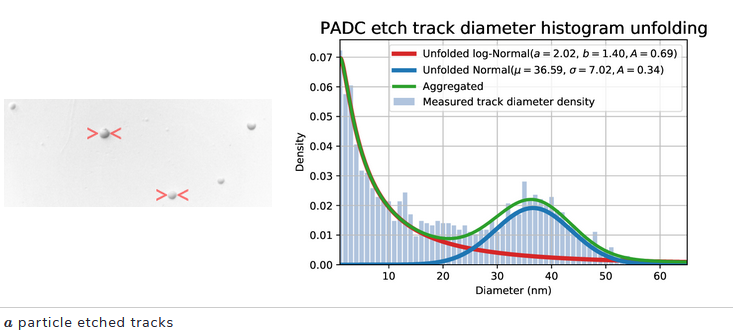 次の例は、PADCエッチングされた核トラックデータを複雑な分布に適合させるためのe04ggの使用法を示しています。 ターゲットシートがスキャンされ、トラックの直径(図の左側の画像の赤いくさび)がヒストグラム(図の右側のプロットの青いバー)に記録され、正規モデルと対数正規混合モデルが得られた実験に適合されます。