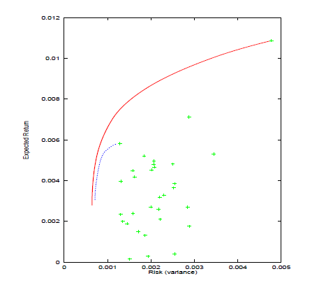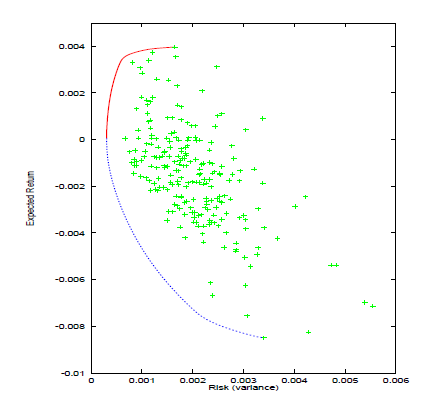 最初の3つの問題は、基本的には数学的に等しく、その解は平均分散(mean-variance: MV)効率性と呼ばれます。リターン−リスクのグラフの有効点は効率的フロンティアと呼ばれます。