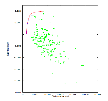 | LP1: | ctx。 この選択肢は分散にかかわらず期待リターンの最大もしくは最小を見つけるのに使用することができます。ベクトル c は期待リターンベクトル a に設定されます。ポートフォリオのウェイトベクトルはx で表されます。 |