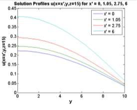 これは偏微分方程式をnAGルーチンd03ec [12]で解くことができる連立代数方程式に変換します。これは方程式の解に陰的手法を積極的に採用しています。図1は等密度面(関数が特定の値をもつボックス内の全ての点と接続する3次元空間の曲線)として表示される解を表しています。また、曲面プロットとして表示される解を表しています。その曲面プロットはボックスから切りとられる2次元スライスによってどのように関数が変化するかを表します。図2は固定された z値でボックスの y 方向に沿って関数がどのように変化するか、また一連の x の値に対してどのように変化するかを表しています。