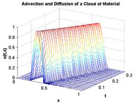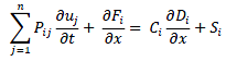 ここで n は偏微分方程式の数とui(t,x) の解の数を表します。Diは(特に)∂ui ⁄∂x の関数です。そのため右辺の最初の項は∂2ui ⁄∂x2 に比例する項(例えば拡散項)を含んでいます。同様にFiはuiに依存し、そのため左辺の2番目の項は移流項となり、一方Si はソース項となります。例題は(単一成分からなる)無数の物質の拡散と移流のシンプルなモデルです: