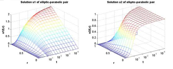 このような問題の初期処理では D 上でメッシュをかけることによる有限差分法が(前述のように)使用されます。これは偏微分方程式を、可変のステップサイズで陰的後退微分公式を使用して時間積分される常微分方程式に変換します。 時間積分から生じる非線形方程式は修正ニュートン法を用いて解かれます。nAG ルーチンd03ra [17]はこれらの技術を使用し、解が急速に変化をしている領域で解の精度を改善するために局所的一様格子の改良を具体化します。最初の例題は空間の2次元領域[17]の2つの化学製品の混合物の単一の一段階反応のモデルです。