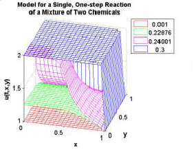 図5は d03ra で計算された (30)の解を表しています。t=0.4 付近で発火が起こる前に、気 温が突然 2.0 に跳ね上がり、反応面が生じ外側に伝播するときに、原点のまわりの円領域(全 領域の四分円をモデリングしていると仮定)で気温が徐々に上昇していることがわかります。 これは以下の式の解にも適用されています [16]。
