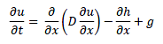 ここで D、h、g は u (モデルシステムの密度)の関数です。3つの関数は拡散、移流、反応 に対応しています; (21)と比較すると以下がわかります。