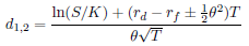ここでθはボラティリティを示します。d1,2は以下の式で表されます。